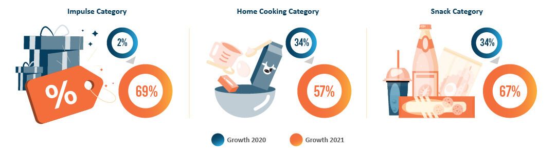 Now let’s dive into the home cooking & snack categories that have been able to maintain high growth since last year. Last year, restaurants and other outdoor food businesses were closed during PSBB. Indeed, more restaurants have opened recently with less than 100% capacity regulation to implement social distancing protocols but some people are still hesitate to eat outside due to the doubt of safeness. So they still prefer to cook at home instead of eating outside. We can also see the increase of the impulse category. Last year’s festive season, which was close to the beginning of the pandemic, made people limit their outdoor activity and rarely shop in-store, thus reducing the purchase of impulse goods due to the high uncertainty in their monthly income. But this year, some of the working sector is getting normal, most people being rehired and their spending power start to grow again.