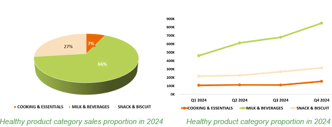 Deepening into each of healthy products purchased in 2024 are Milk & Beverages category. The high proportion of Milk and Beverages product sales is reflected by significant increase in the number of customers purchased starting from Quarter 2 of 2024.