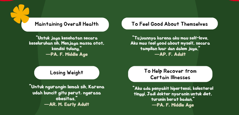 Besides maintaining their daily consumption, they also engage in various exercises. The majority of respondents have incorporated physical exercise into their routine, typically 2-3 times a week, as they believe it helps manage weight, reduce the risk of disease, and enhance their ability to perform daily activities.