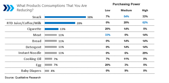 The majority of consumers reduce their shopping consumption, especially in shopping for snacks, RTD juice/coffee/milk, and cigarettes. Meanwhile, consumers with low purchasing power also reduce meat consumption.