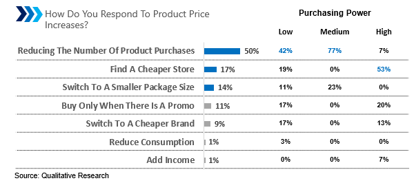Interestingly, consumers with low purchasing power prefer reduced package content to product price increases. Meanwhile, consumers with middle to high purchasing power prefer a product price increase rather than a reduction in package contents.