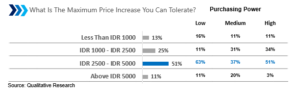 In response to price increases, the majority of consumers reduce the number of products purchased. In contrast to consumers with high purchasing power, they tend to look for cheaper stores. The maximum price increase they can tolerate is around IDR 2,500 – IDR 5,000.