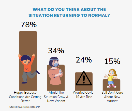 Based on a PT Global Loyalty Indonesia survey, 87% of people know that the government allows masks outdoors. However, there are two different views, 47% of people fear that other virus variants will appear on June 6, 2022, [2] has entered and confirmed positive for New Variant Omicron BA.4 and BA.5 in Indonesia. Meanwhile, 45% of people feel happy because when the government allows them to take off their masks outdoors, it means the pandemic is improving or more controlled.