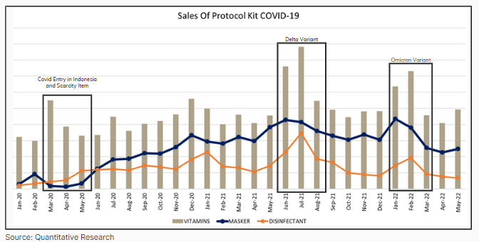 With the current situation, people's tendency to buy protocol kits has decreased after the omicron variant. However, compared to the initial appearance of COVID-19, sales of COVID-19 protocol kits are still higher. The graph shows that there is a new habit that we are doing to keep buying or keeping stock of the covid-19 protocol kit, especially for the sales of masks. Because people still buying even though they have been allowed to take off masks outdoor.