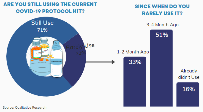 Also, 71% of the people are still using the covid-19 protocol kit. However, 22% of people have rarely used it, and they rarely used the protocol kit when 3-4 months ago or after the omicron variant.