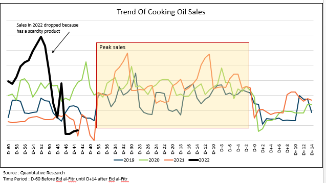 The trend of cooking oil sales for the last three years (2019-2021), has the same pattern during Eid al-Fitr which the peak sales happened from D-38 until D+2 Eid al-Fitr. However, there is a different pattern in 2022, the peak sales of cooking oil happened D-55 Eid al-Fitr because the government subsidizes the cooking oil[¹], the demand increased significantly meanwhile the supply is limited in the market and this condition caused a scarcity of cooking oil. In addition, as reported by Detik News[²], Kasatgas Pangan Polri Irjen Helmy Santika explained that the scarcity of cooking oil is also caused by wholesale action and stock holding in amounts above the average monthly requirement resold by resellers or speculators at prices above the provisions.